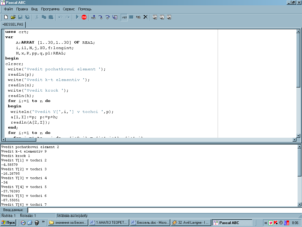 Рисунок 3.1- Введення початкових значень та даних з таблиці та виведення кінцевого результату.