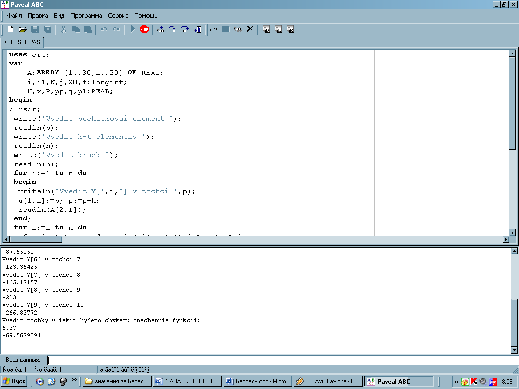 Текст програми міститься у файлі kursach.pas, де описані всі змінні та присвоєні їм певні значення, необхідні для обчислення значення функції інтерполюванням за формулою Бесселя, а також власний процес обчислення методу. З метою ефективного використання пам’яті для збереження початкових значень системи, вони зберігаються в динамічній пам’яті, що дозволяє відводити під них місце динамічного розміру в залежності від кількості заданих даних.