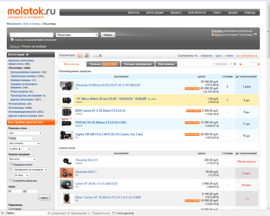 Молоток.ру – самый крупный в интернет-аукцион в русскоязычной части интернета, позволяет пользователям продавать б. у. и новые вещи, технику и многое другое (см. рисунок 2). Достаточно большой выбор б.у. фототехники, основным недостатком является то, что нет единой базы оборудования в самом сервисе, поэтому описание товаров приходится искать на других сайтах, что весьма не удобно. Товары размещают в основном только физические лица, нет информации о ценах в магазинах. Очень затруднено общение пользователей.