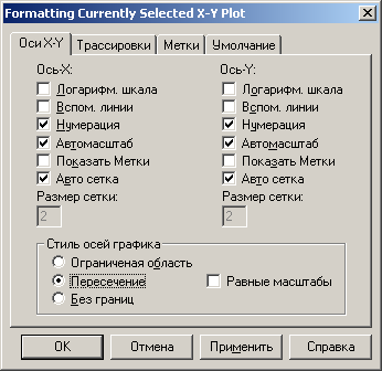 В этом окне 1.на Вкладке Ось X-Y установитьпереключатель Пересечение 2.на Вкладке Трассировки можно установить цвет и толщину линии |