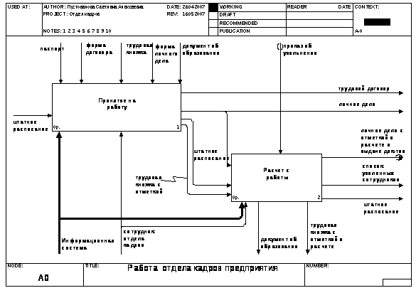 При подробном изучении данной предметной области можно прийти к выводу, что информационная система значительно упростит работу сотрудников отдела кадров. С созданием данной системы все функции (за исключением проставления отметки в трудовую книжку и выдачи документов) практически полностью автоматизируются, значительно упрощаются и уменьшается вероятность случайных ошибок, возникающих в силу влияния человеческого фактора. Например, при принятии на работу или при расчете необходимо произвести изменение штатного расписания, что может быть не выполнено из-за простой забывчивости сотрудника, а в данной информационной системе эта функция производится полностью автоматически, т.е. вероятность ошибки в данном случае исключена и в отчет по штату предприятия не попадет давно уволенный сотрудник. Необходимо также отметить, что отдел кадров подразумевает работу с большими объемами данных и данная система призвана не только исключить случайные ошибки, но и уменьшить временные затраты на обработку, поиск данных, выполнение функций, составление отчетности. Проведение итогово-отчетной работы полностью автоматизировано, например, для составления списка уволенных за определенный период сотрудников специалисту отдела кадров достаточно нажать одну кнопку и задать необходимый период (в то время как раньше сотруднику приходилось перебирать огромное количество личных дел, при этом проверяя дату увольнения вручную). Таким образом, вся работа сотрудника отдела кадров, с внедрением информационной системы, сводится к минимуму. Это особенно проявляется при сравнении схем AS IS и TO BE. что создание системы позволит упростить работу сотрудника отдела кадров, информационная система возьмет на себя значительную часть работы по составлению документации и личных дел сотрудников.