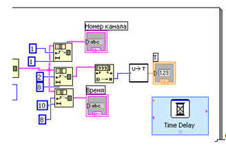 Далее из слова выделяем информацию, используя функцию String sub>set с разным значением сдвига и количеством считываемых символов. Номер канала и время измерения в виде строк выводим на лицевую панель, спомощью индикаторов. А сигнал от АЦП преобразуем обратно в числовое значение с помощью функции Decimal String To Number (Строку десятичных цифр в число).