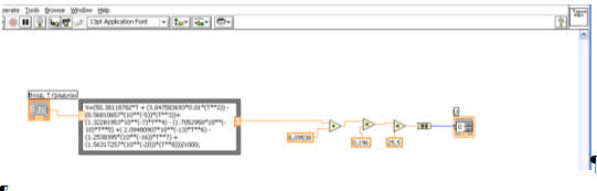 Блок – диаграмма виртуального прибора для обратного преобразования сигнала от АЦП в температуру:
