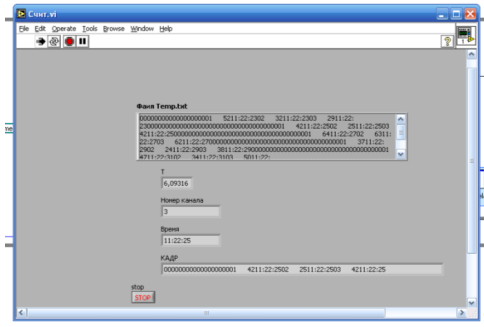 В ходе выполнения работы я смоделировал виртуальный прибор для измерения температуры, которая изменяется со временем. Для этого смоделировал виртуальный прибор - измерительный канал. Полученные значения от разных каналов записал в один кадр вместе со служебной информацией, для дальнейшей передачи, хранения и обработки данной информации. Кадры записал в текстовый файл Temp.txt. Затем создал виртуальный прибор, который считывает кадры из файла, выделяет кадры и слова, преобразует их в вид удобный для визуального восприятия и отображает на лицевой панели.