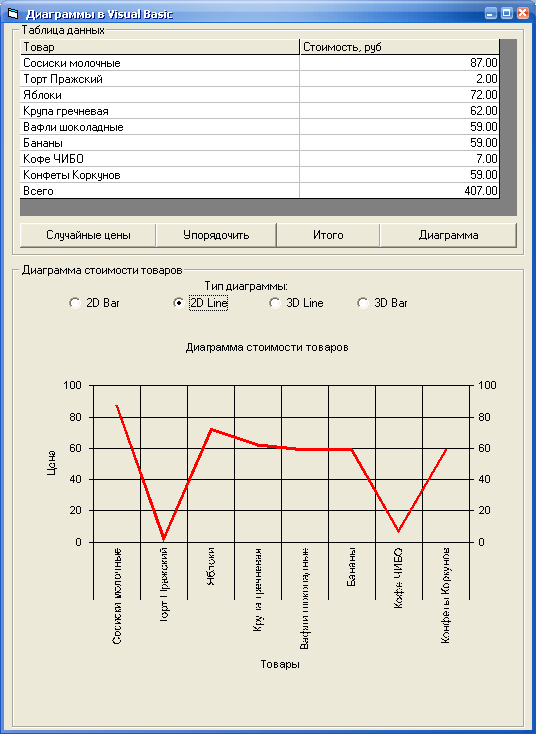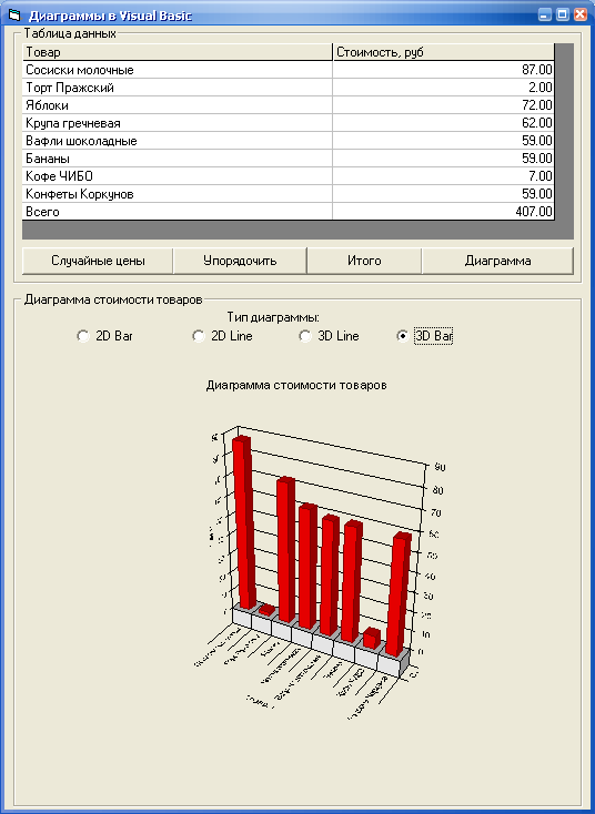Form1.MSChart1. Title = «Диаграмма стоимости товаров»