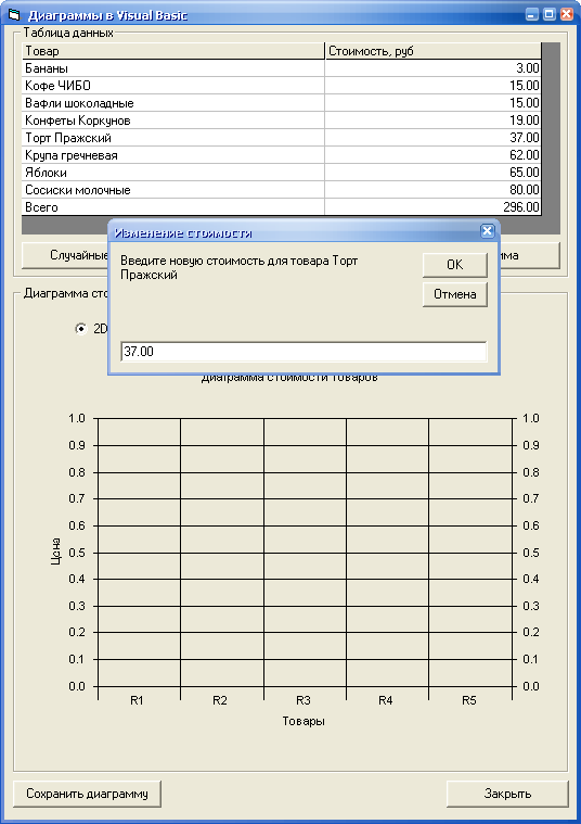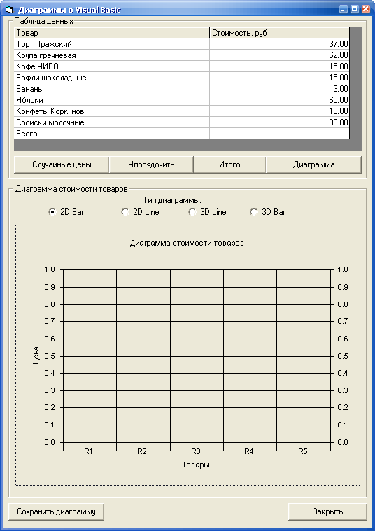 На форме присутствуют четыре кнопки, предназначенные для различных операций с этим списком товаров, а также кнопка закрытия формы и сохранения полученной диаграммы.
