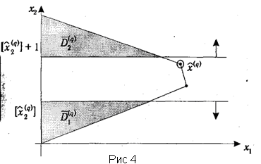 и содержит только целые компоненты, то, значит, найдено решение основной задачи 2-3. В противном случае среди всех концевых подмножеств, полученных как на предыдущих (D>i>(q)), так и на текущем (D>1>(q), D>2>(q)) этапе, выбирается область с наибольшей оценкой ξ(D>i>(q)). Она становится текущим рассматриваемым подмножеством (D(q+1)). Далее производится перенумерация концевых множеств и вычислительный процесс итеративно повторяется.