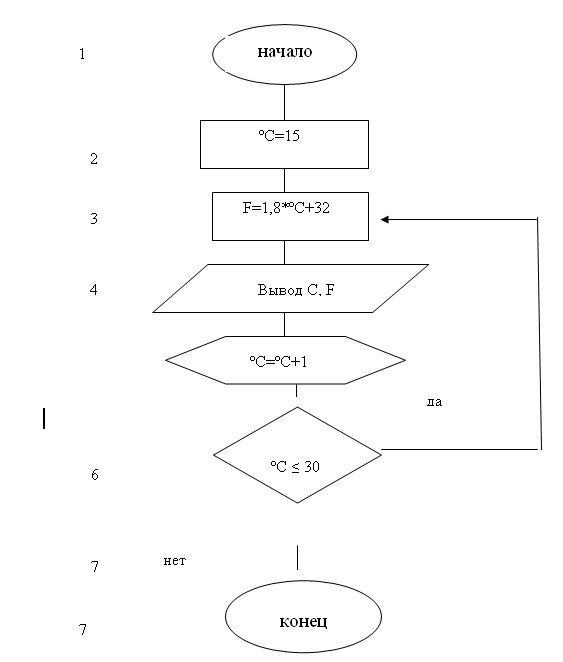Напечатать таблицу перевода температуры из градусов по шкале Цельсия (ºС) по шкале Фаренгейта (F), для значений от 15 ºС до 30 º с шагом 1 ºС. Перевод осуществляется по формуле F=1,8*ºС+32.