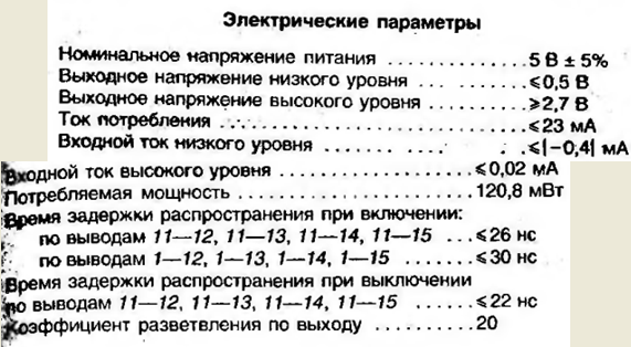 В данной работе выбраны микросхемы серии К555. Отличие их от микросхем серии К155 – использование транзисторов с коллекторными переходами, зашунтированными диодами Шотки. В результате транзисторы микросхем серии К555 не входят в насыщение, что существенно уменьшает задержку выключения транзисторов. К тому же они значительно меньших размеров, что уменьшает емкости их р-n-переходов.