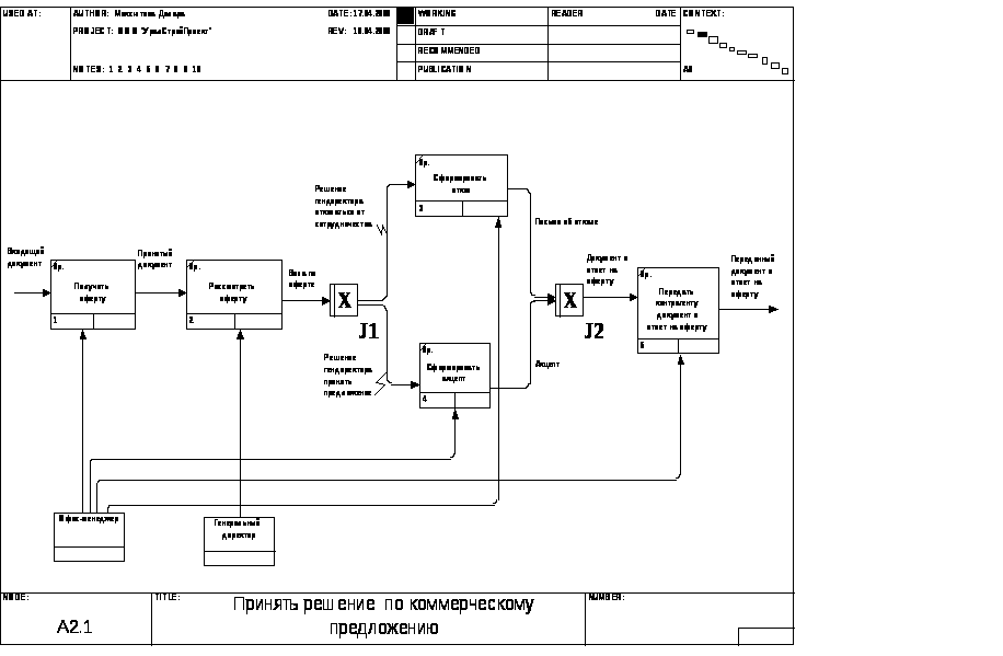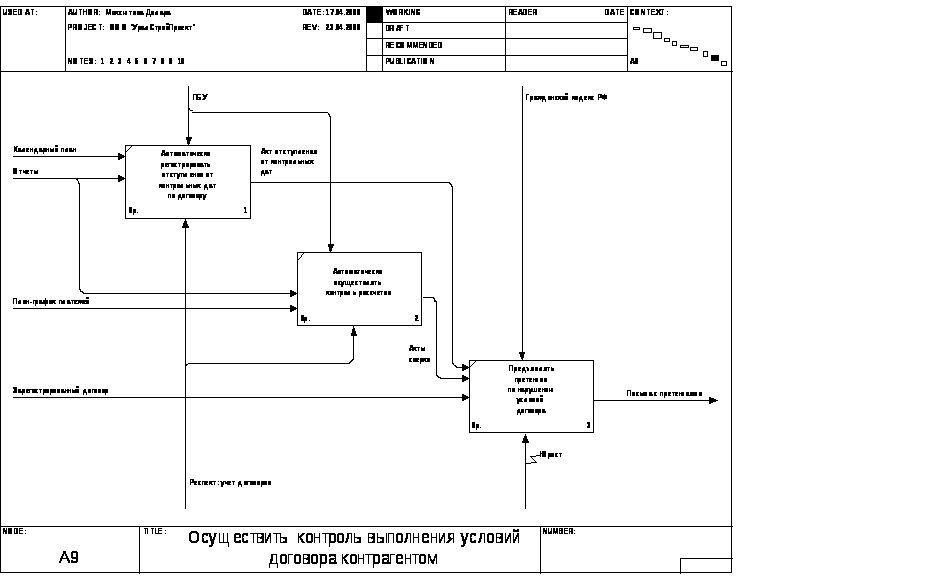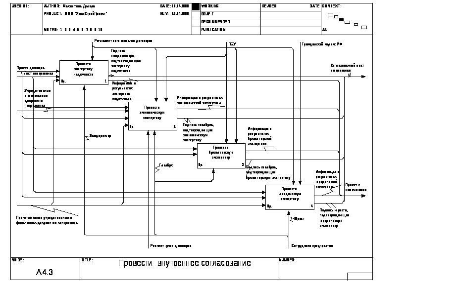 Данная функциональная модель построена по методологии IDEF0, при помощи ERP-системы Computer Associates BPWin. Контекстная диаграмма процесса учета договоров на предприятии представлена на рис. 3. На рис. 4 изображена ее дочерняя диаграмма 2-го уровня. Рис. 5-7, 15-17 представляют собой декомпозицию функциональных блоков диаграммы рис. 4, причем диаграмма рис.5 представлена с помощью методологии IDEF3. Рис. 8, 9, 14 представляют собой декомпозицию функционального блока «Оформить проект договора» (Рис. 7), а рис. 10-13 представляют собой декомпозицию функционального блока «Провести внутреннее согласование» (Рис. 3).