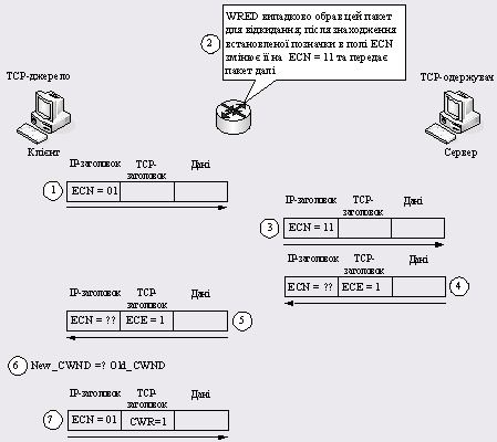 Приклад використання механізму ECN наведений на рис. 5. Для успішної роботи механізму ECN TCP-джерело і TCP-одержувач мають повідомити один одного про підтримку поля ECN. З цією метою TCP-джерело встановлює в заголовку пакета біти ECN у 01 (або 10) і передає пакет (крок 1 на рис. 5). Якщо TCP-джерело не підтримує механізм ECN, то відповідні біти будуть встановлені в нулі (ECN=00). Припустимо, на маршрутизаторі R1 з метою запобігання перевантажень використовується механізм WRED, і він випадково обрав саме цей переданий пакет для відкидання. Однак, знайшовши значення ECN=01, маршрутизатор не відкине пакет, а замінить значення поля ECN на 11 – сигнал про перевантаження – і передасть пакет далі (крок 2).