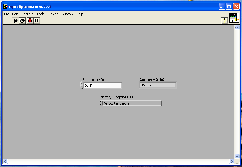 Для набора экспериментально полученных данных (см. таблица 1) определить функциональную зависимость частоты от давления и реализовать ее в пакете LabVIEW.