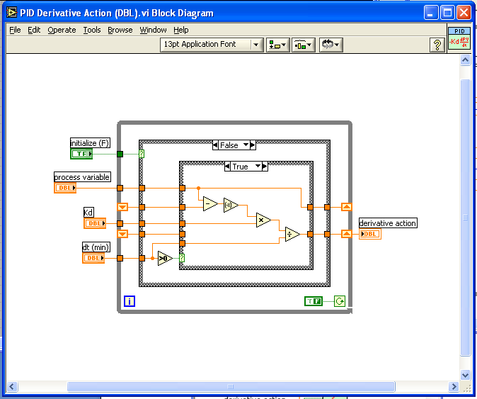 Для синтеза системы регулирования с использованием инструментов библиотеки ПИД-регулирования LabVIEW, достаточно вставить виртуальный инструмент "PID.vi" в поле редактора диаграмм и задать для него соответствующие входные и выходные переменные. Если связать входы и выходы регулятора с инструментальными платами, внешними модулями ввода/вывода или стандартными портами, то получится действующая система регулирования в реальном времени.