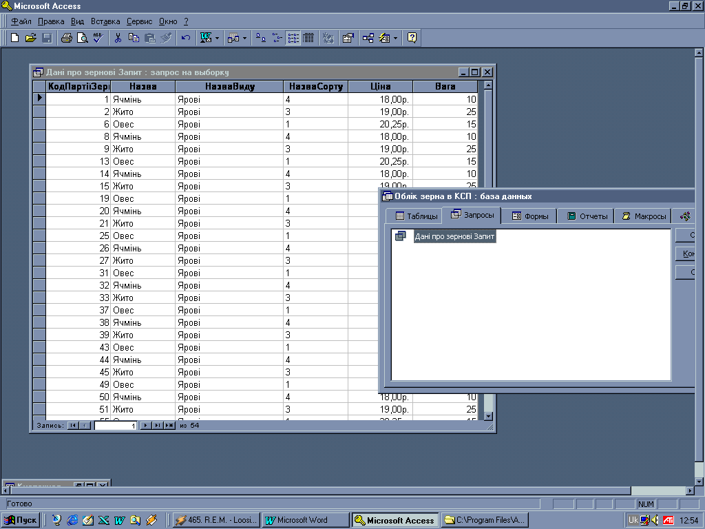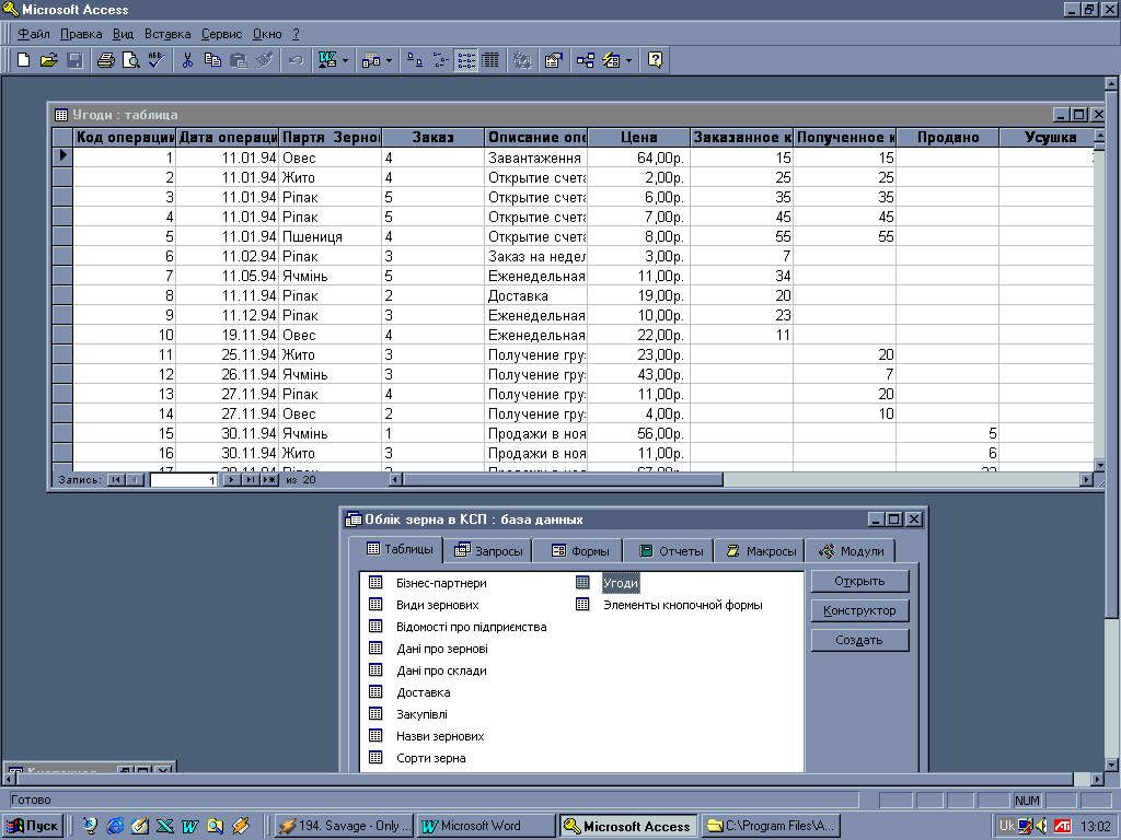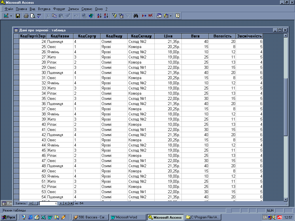 1. Спроектувати та побудувати на основi СУБД Access iнформацiйно-довiдкову систему обліку зернових в приватному сільськогосподарському підприємстві у виглядi бази даних та засобів її супроводу (пiдтримки). База даних має мiстити мiнiмум 50 записiв (в головній таблиці). Система повинна виконувати операцiї