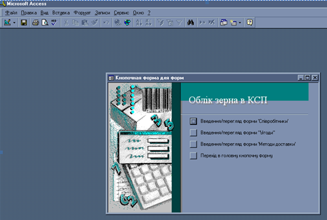 Для роботи з системою необхiдно завантажити у Windows-95 через кнопку “Пуск” СУБД Access та відкрити в ньому базу “Облік зерна в КСП”. Після завантаження програмного засобу на екрані монітора виникає головна кнопочна форма бази даних з інтуїтивно зрозумілим інтерфейсом. В ній сконценровані всі наявні функції програмного засобу, а також кнопка “Вихід”.