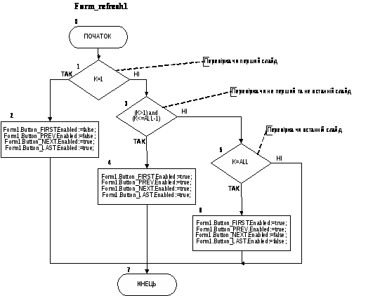 Програма має графічний інтерфейс і розроблена об’єктно-орієнованою мовою Delphi. Тому її склад відрізняється від звичного складу програми, розробленої при процедурному програмуванні. Програма включає 8 процедур обробки натиснення кнопок (Button_RUNClick, Button_CLOSEClick, Button_NEXTClick, Button_PREVClick, Button_FIRSTClick, Button_LASTClick, Button_Way_to_FileClick, Button_NUMBERClick) на формі і 1 процедуру (Form_refresH2), що контролює їх натискання для того, щоб програма не завершилася аварійно з помилкою.