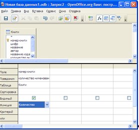 Определение запроса выполняется в нижней области окна. Чтобы определить запрос, укажите имена полей базы данных, которые требуется включить, а также условия отображения полей. Чтобы переупорядочить столбцы в нижней области конструктора, перетащите заголовок столбца в новое расположение или выберите столбец и нажмите CTRL и клавишу со стрелкой. Создадим запрос, который будет выводить количество книг, в библиотеке (Рисунок 21).