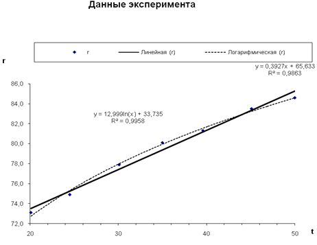 Окончательно принимаем линию, достоверность которой R2, ближе к единице, т.е. в нашем случае Логарифмическую – R2=0,9958>0,9863