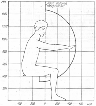 Согласно [4] конструкцией рабочего места должно быть обеспечено выполнение трудовых операций в пределах зоны досягаемости моторного поля. Зоны досягаемости моторного поля для средних размеров тела человека приведены на рисунках 1 и 2.