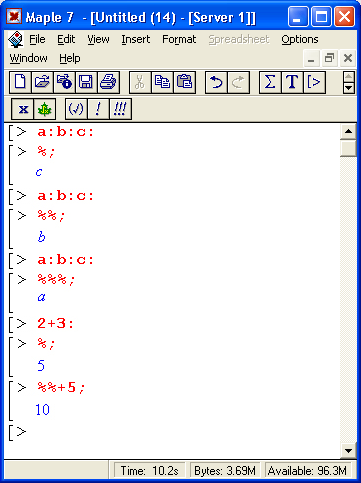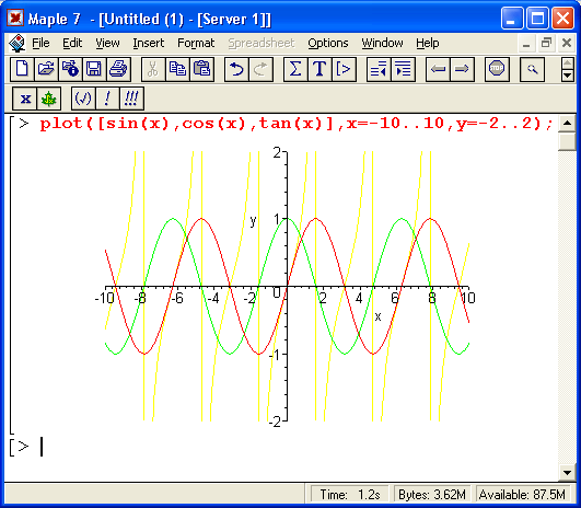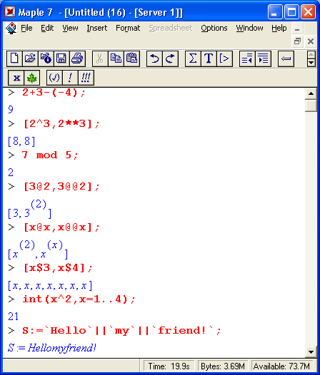 Maple 7 имеет множество встроенных функций, включенных в его ядро и в пакеты. Функция в выражениях задается вводом ее имени и списка параметров функции (одного или нескольких), заключенного в круглые скобки, например sqrt(2) задает функцию вычисления квадратного корня с параметром 2 (численной константой). Основным признаком функции является возврат значения в ответ на обращение к ней по имени (идентификатору) с указанием списка параметров функции. |