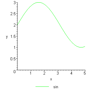 sn:=plot(s, x=0..5, y=0..3, color=green, legend=sin):