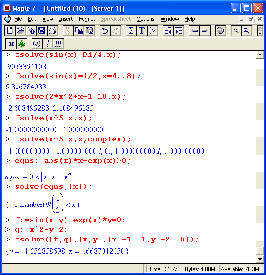Содержит несколько функций для решения уравнений и систем уравнений. Функции могут находить корни уравнений с параметром. Также имеется функция для особых решений. |
