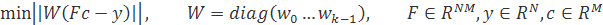 Здесь c обозначает искомый вектор коэффициентов. Столбцы матрицы F соответствуют базисным функциям (всего M столбцов), строки - экспериментальным точкам (всего N строк), Fij содержит значение j-ой базисной функции в i-ой точке набора данных. Вектор y содержит значения аппроксимируемой функции в точках, соответствующих строкам матрицы F. Матрица W является диагональной матрицей весовых коэффициентов, элементы которой соответствуют важности той или иной точки. Матрица C задает дополнительные ограничения, которым должна удовлетворять аппроксимируемая функция - минимум ошибки ищется среди функций, точно удовлетворяющих заданным ограничениям. В такой формулировке задача сводится к решению системы линейных уравнений. Полученная система линейных уравнений, как правило, является переопределенной - число уравнений намного больше числа неизвестных. Для решения используется основанный на QR-разложении солвер. Сначала матрица A представляется в виде произведения прямоугольной ортогональной матрицы Q и квадратной верхнетреугольной матрицы R. Затем решается система уравнений Rx = Q Tb. Если матрица R вырождена, алгоритм использует SVD-разложение, которое позволяет добиться решения независимо от свойств матрицы коэффициентов. Трудоемкость решения такой задачи составляет O(N·M 2).