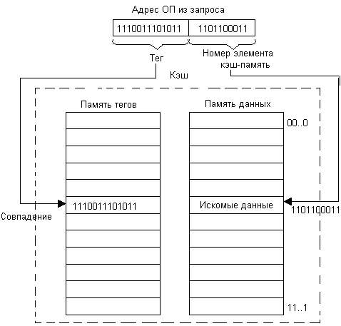 При поиске данных в кэше используется быстрый прямой доступ к записи по номеру строки, полученному путем обработки адреса оперативной памяти из запроса. Однако поскольку в найденной строке могут находиться данные из любой ячейки оперативной памяти, младшие разряды адреса которой совпадают с номером строки, необходимо выполнить дополнительную проверку. Для этих целей каждая строка кэш-памяти дополняется тегом, содержащим старшую часть адреса данных в оперативной памяти. При совпадении тега с соответствующей частью адреса из запроса констатируется кэш-попадание.