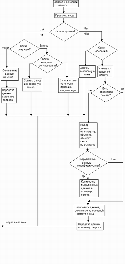 Из схемы видно, что когда выполняется запись, кэш просматривается только с целью согласования содержимого кэша и основной памяти. Если происходит промах, то запросы на запись не вызывают никаких изменений содержимого кэша. В некоторых же реализациях кэш-памяти при отсутствии данных в кэше они копируются туда из основной памяти независимо от того, выполняется запрос на чтение или на запись.