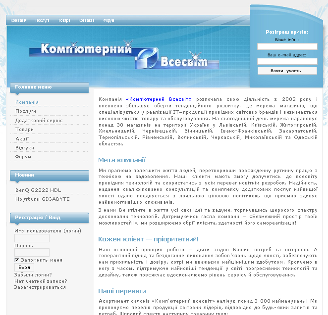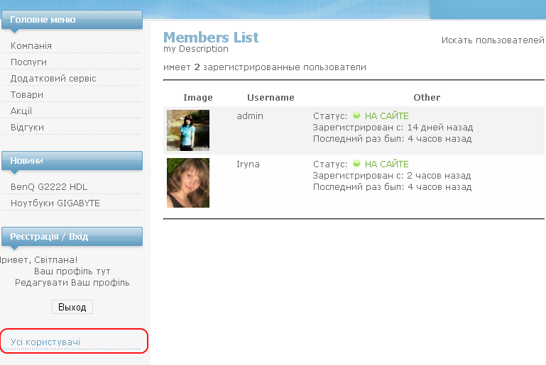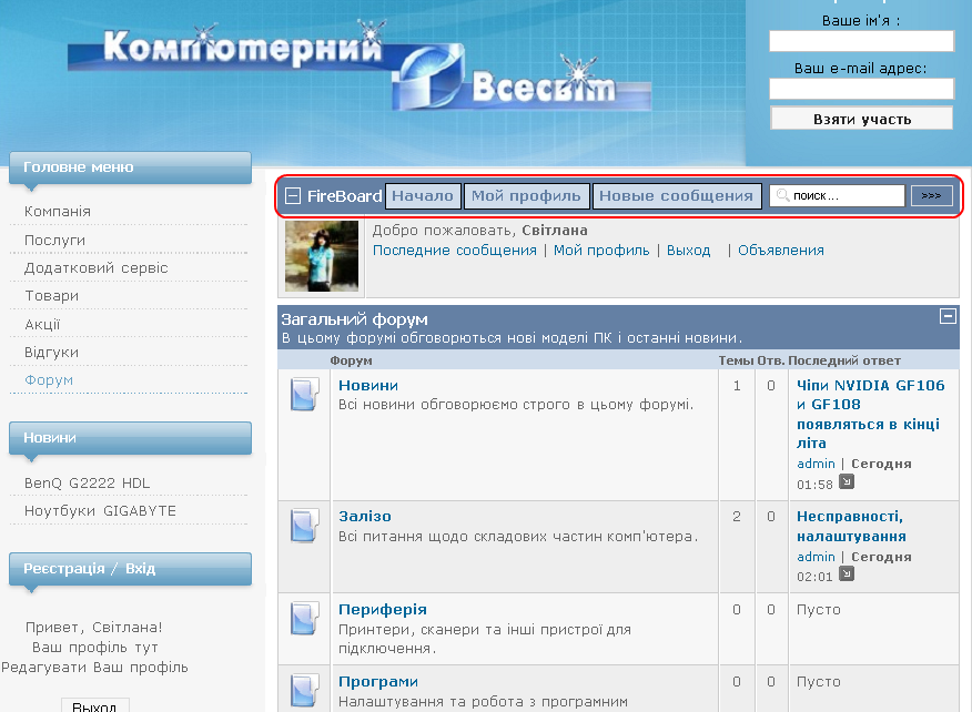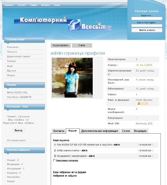 Головна сторінка сайту для зареєстрованого користувача (Рис.41) :