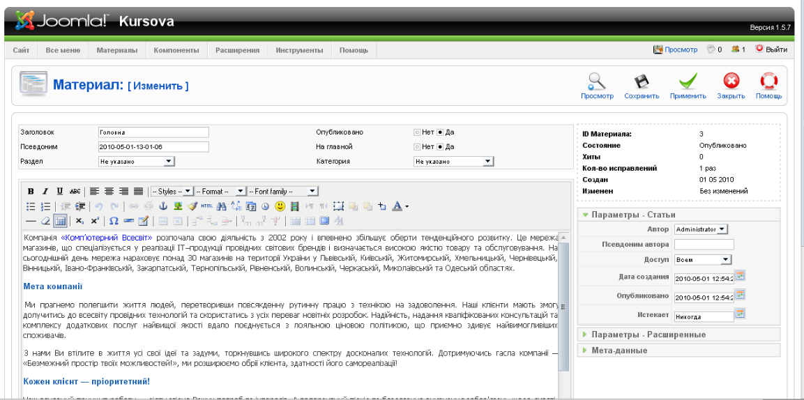 Вбудований WYSIWYG-редактор сторінок сайту;