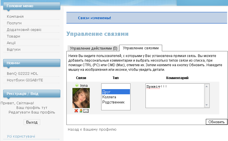 Тепер зайдемо під другим користувачем (Ірина), там появилась вкладка Зв’язок і встановлюємо зв’язок з попереднім користувачем (Admin), який повинен буде підтвердити цей зв’язок. Можна спочатку переглянути сторінку, того хто просить встановити зв’язок і тоді вирішувати чи підтверджувати чи ні (Рис.28):
