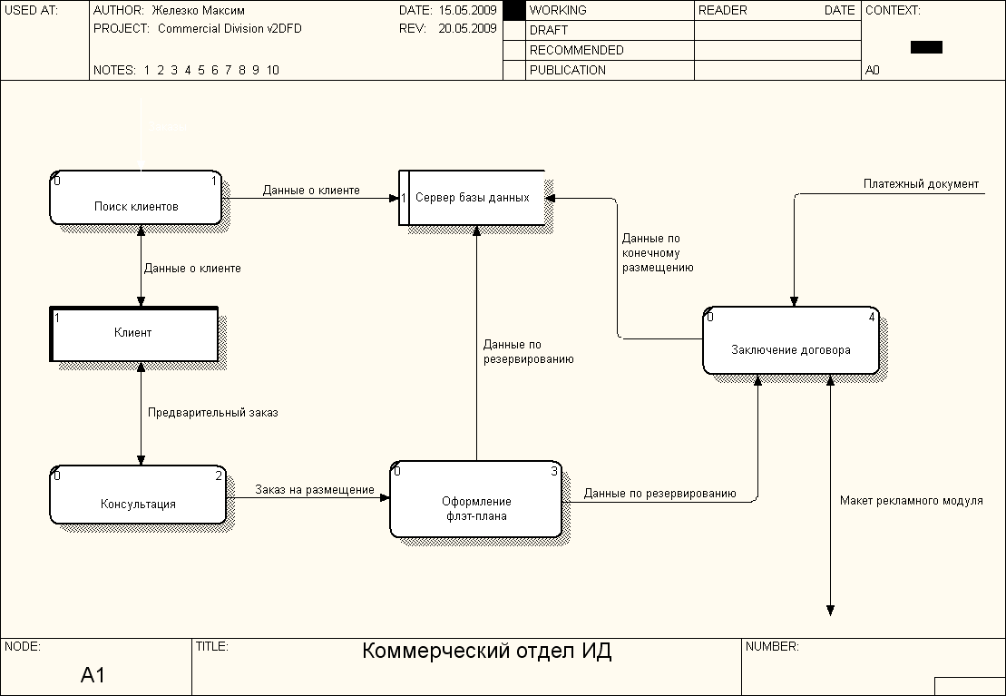 На рисунке 1 представлена диаграмма верхнего уровня на основе методологии IDEF0. На ней изображен основной процесс, в котором задействованы коммерческий отдел ИД и CRM-система.