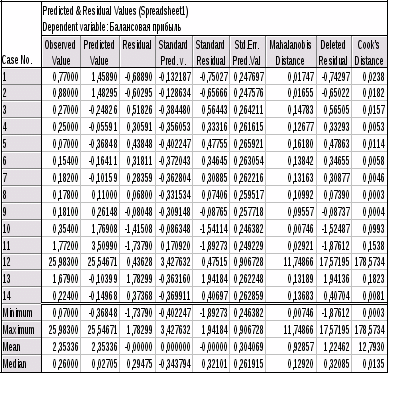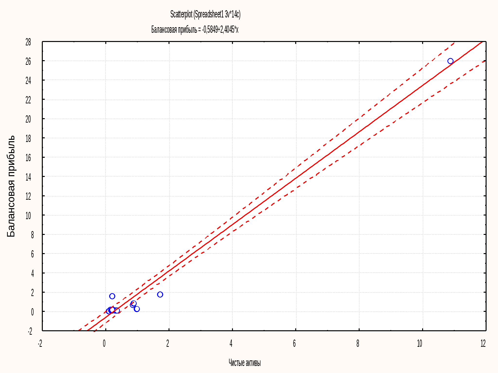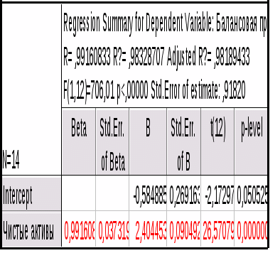 Вывод: Мы провели всесторонний анализ однофакторной линейной эконометрической модели зависимости балансовой прибыли крупнейших банков Украины от значения чистых активов их деятельности.