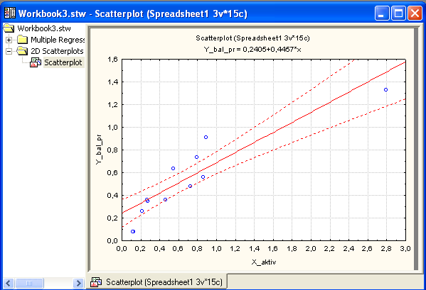 Построим график линейной функции с доверительными интервалами. Для этого в меню Graphs/Scatterplits необходимо указать переменные, линию уровня и доверительные интервалы (рис. 3).