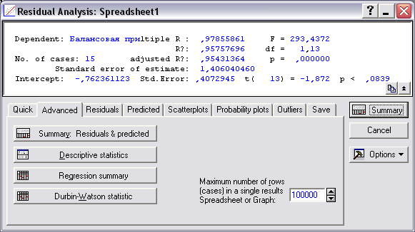 Кнопка анализа ошибок Summary: Residuals & Predicted показывает наблюдаемые значения зависимой переменной (Observer value), теоретические значения зависимой переменной (Predicted value) и ошибки модели (Residual) как разность наблюдаемых и теоретических значений (рис.6).