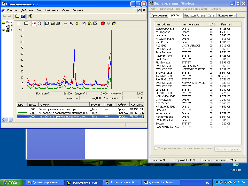 Одним из первых действий администратора является проверка Диспетчера задач. В нем возможно наблюдение за количеством работающих процессов, а также за процентом загруженности процессора. Далее с помощью счетчиков производительности: % работы в пользовательском режиме и % работы в привилегированном режиме, устанавливается какого рода деятельность занимается процессор. При одновременном просмотре результатов счетчиков и диспетчера задач возможно установить соответствие процесса пику на графике производительности (рис. 1).