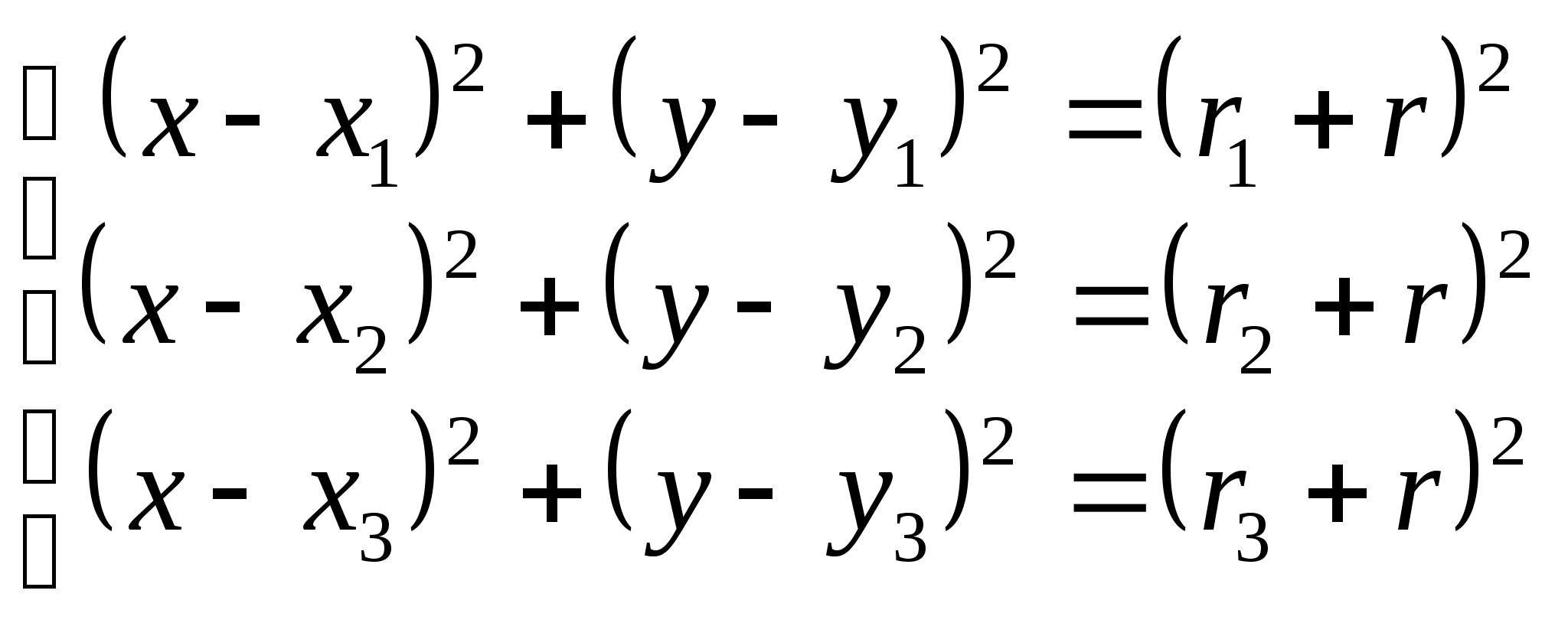 Найдём пересечение трёх окружностей (одну точку), центры которых совпадают с данными, а радиусы увеличены на одинаковую величину