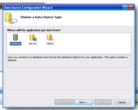 1. В Visual Studio мы работаем в проекте Windows Application, после чего используем окно Data Sources для выбора источника данных.Нажмем кнопку Add New Data Source нa панели инструментов окна для запуска мастepa Data Source Configuration Wizard. На первой странице этого мастера (рис. 2) выбераем тип источника данных: Database — источник данных является таблицей в реляционной базе данных.
