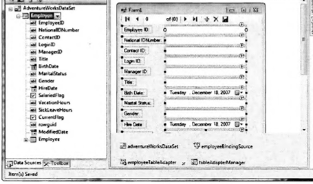 6. B Visual Studio имеется визуальный конструктор, предназначенный исключительно для редактирования (и создания) типизированных наборов данных: это DataSet Designer. Этот визуальный конструктор запускается автоматически тогда, когда мы открываем элемент проекта DataSet. Конструктор DataSet Designer можно легко использовать для настройки наборов данных. На рисунке 9 показан открытый в DataSet Designer созданный ранее Adventure WorksEmployeeDataSet.