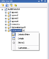 4. Следующий шаг: установление соответствия между элементами источника данных и элементами управления нашей формы для того чтобы действительно легко и быстро создать привязанные к данным элементы управления, нужно позволить Visual Studio сделать это за нас. В окне Data Sources нажимаем кнопку раскрывающегося списка возле имени источника данных (для того чтобы получить меню рис. 6). Это меню позволяет нам настроить параметpы генерирования элементов управления.