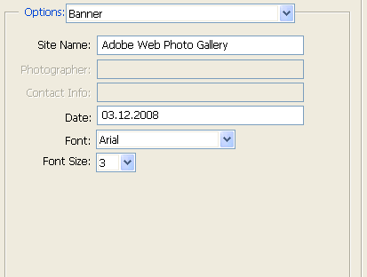 Погляньте на нижню частину діалогового вікна Web Photo Gallery, де розташовуються настройки розділу Options (Параметри). У списку, що розкривається, є декілька пунктів можливих настройок, які ми і розглянемо.