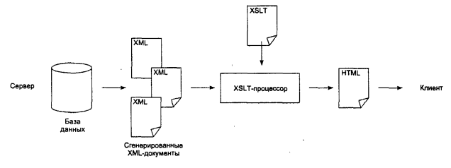 Применение XSLT на стороне сервера совершенно незаметно для клиента – он, как и раньше, в ответ на свой вопрос получает HTML или документ в другом требуемом формате. В данном случае связка XML+XSLT является дополнительным звеном, дополнительным уровнем абстракции, который позволяет отделять данные от презентации, добиваясь простоты и универсальности. Создание преобразований для генерации HTML по имеющимся XML-документам – задача совершенно иного плана, чем написание серверных приложений и программ, которые непосредственно работают с результатами выполнения запросов к базе данных.