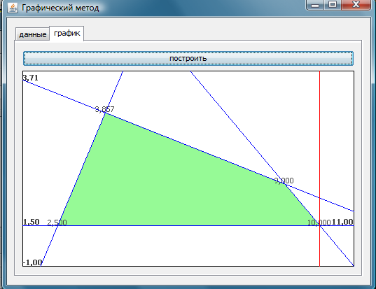 Интерфейс программы, реализующей графический метод решения задач линейного программирования: