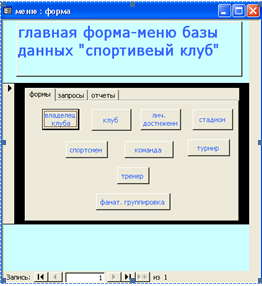 Современные компьютерные системы характеризуются необходимостью удовлетворять разнообразным требованиям многочисленных пользователей. В процессе создания интерфейса базы данных «Спортивного клуба» были созданы следующие элементы: