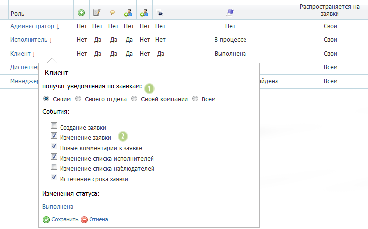 Ви самі визначаєте групи заявок (1), події (2) і зміни статусів, які вимагають повідомлень. Повідомлення настроюються за каскадним принципом - від загального до окремого. Ви можете настроїти повідомлення для ролей у рамках бізнес-процеса, перевизначити налаштування для ролей конкретного сервісу, і навіть для окремих користувачів сервісу.
