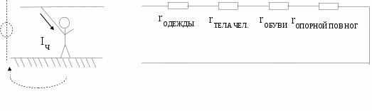 r>од >- сопротивление одежды, зависит от толщины, материала и влажности. Сопротивление сухой одежды 3-5 кОм, влажной 1 кОм.