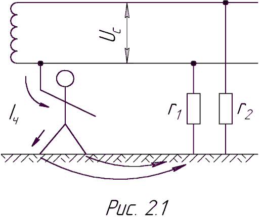 Розглянемо 2-х полюсне дотикання до однофазної мережі (рис. 2.)