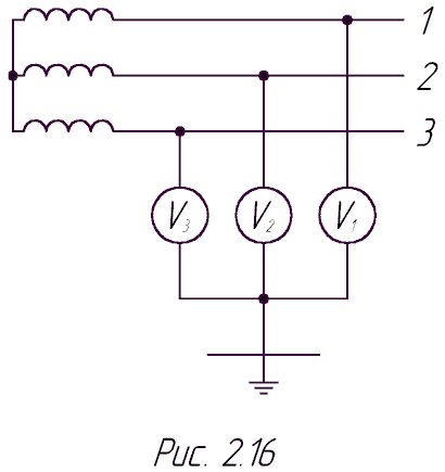 Рис. 16. Схема контролю ізоляції методом 3-х вольтметрів. |