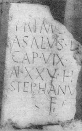 Она дает нам возможность установить имя умершего – Primus, затем его происхождение из Паннонского племени азалов, его военный чин d[upl](iciarius) скорее чем d[ec](urio)21, войсковую часть (ala) Cap(itoniana) (известную уже по надписи из Августы), время, какое он прослужил,– двадцать пять лет,– и, наконец, имя того, кто позаботился поставить ему памятник, – Stephanu[s].